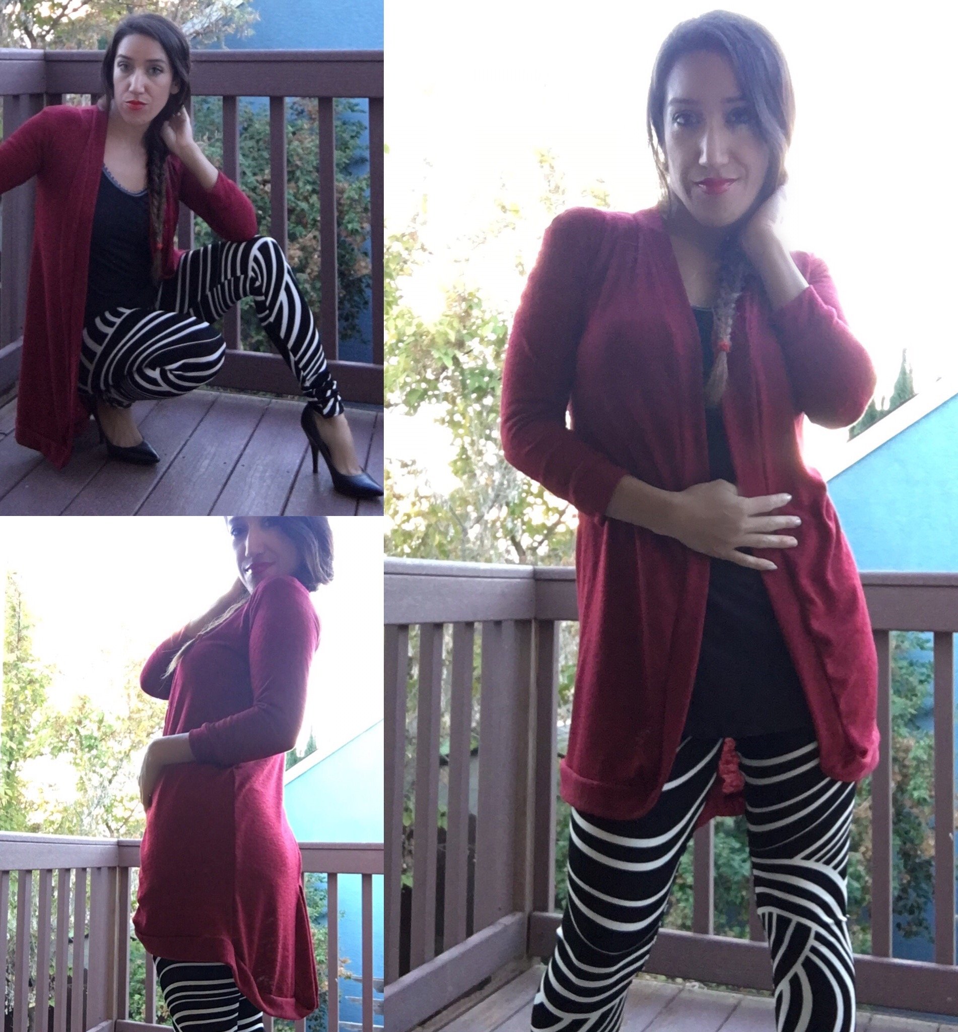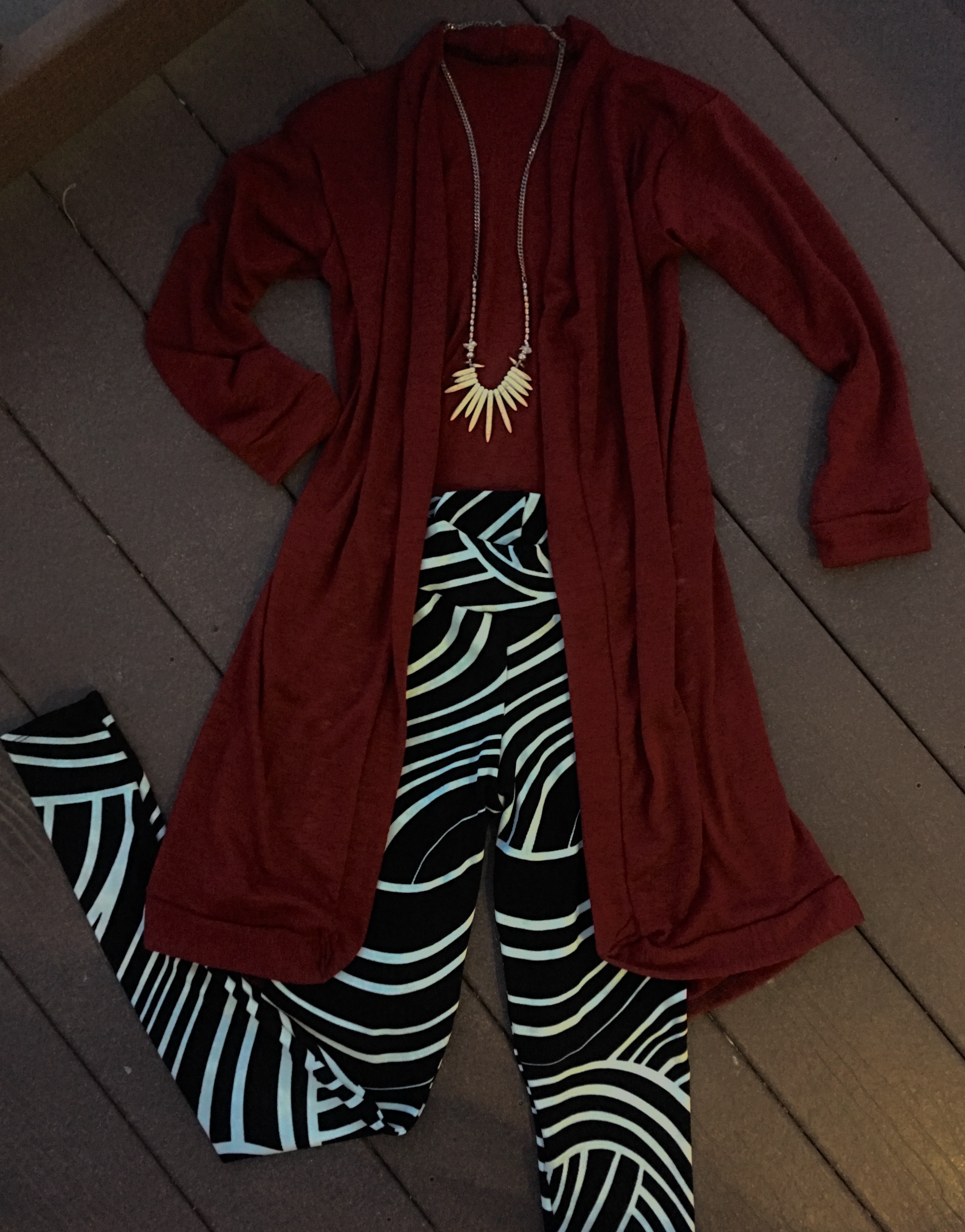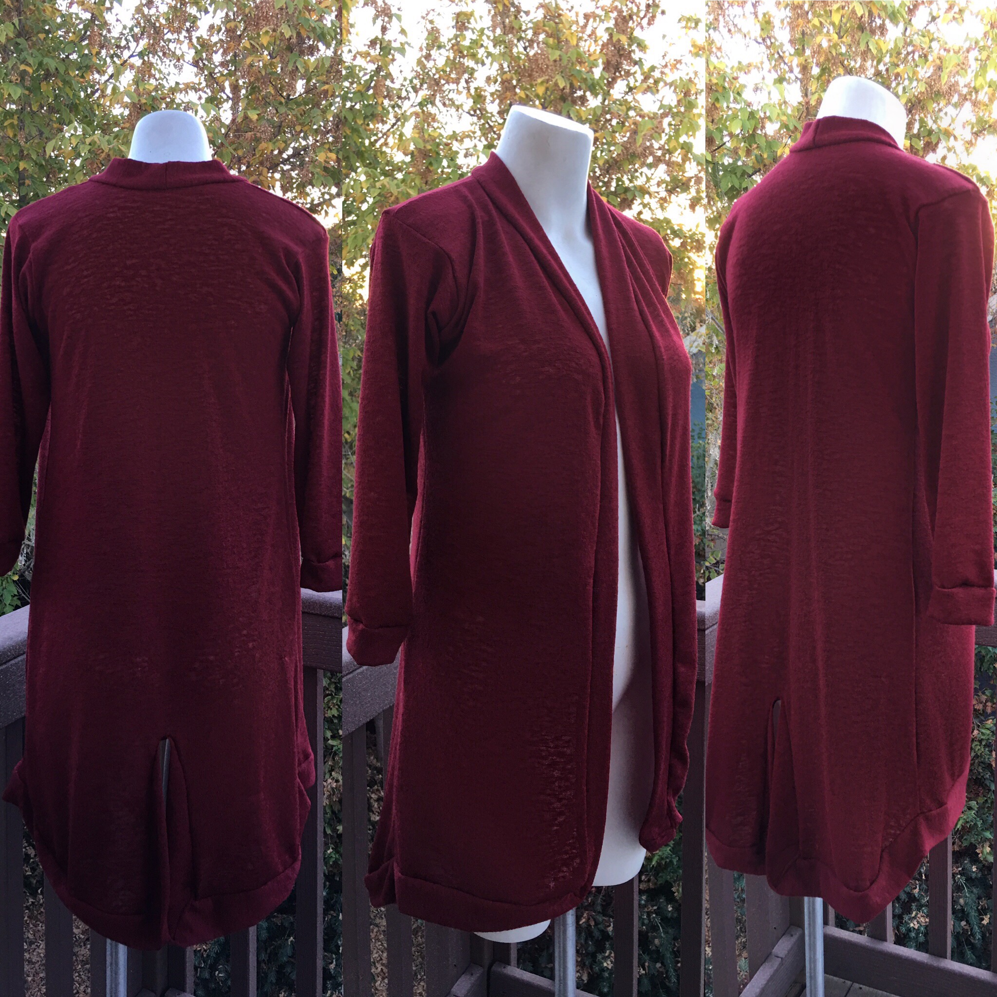 Extra-long cut cardigan with a slim-fit, slit in the back and finished with a matching band all along the edge. Choose any of our soft, gorgeous sweater knits and a coordinating print or solid for leggings.