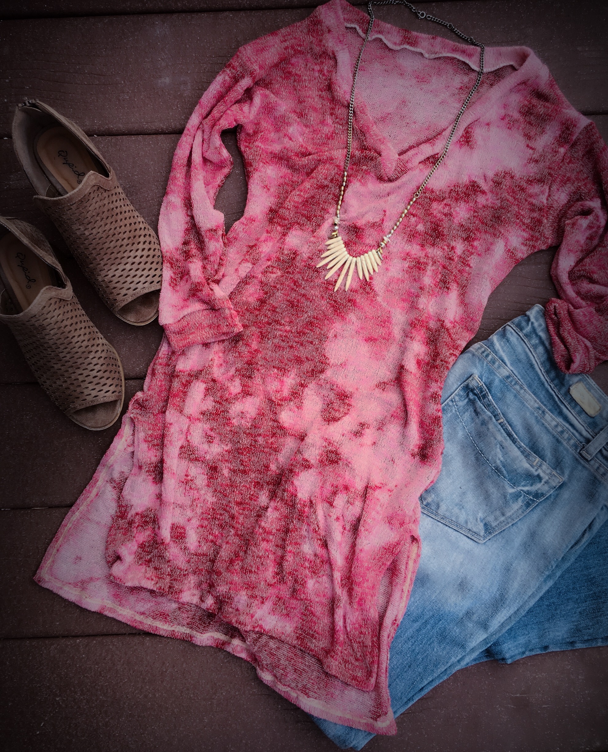 Our NEW V Pullover Tunic is the perfect addition to every gals closet! This super soft sweater knit is oh~so~comfy long, semi-fitted bodice in tunic length, v-neckline, 3/4-length sleeves and modest side slit with step-hemline❤️ This gorgeous piece is hand dyed in-house and available in this gorgeous Merlot tie dye, black tie dye or in solid sweater knit.